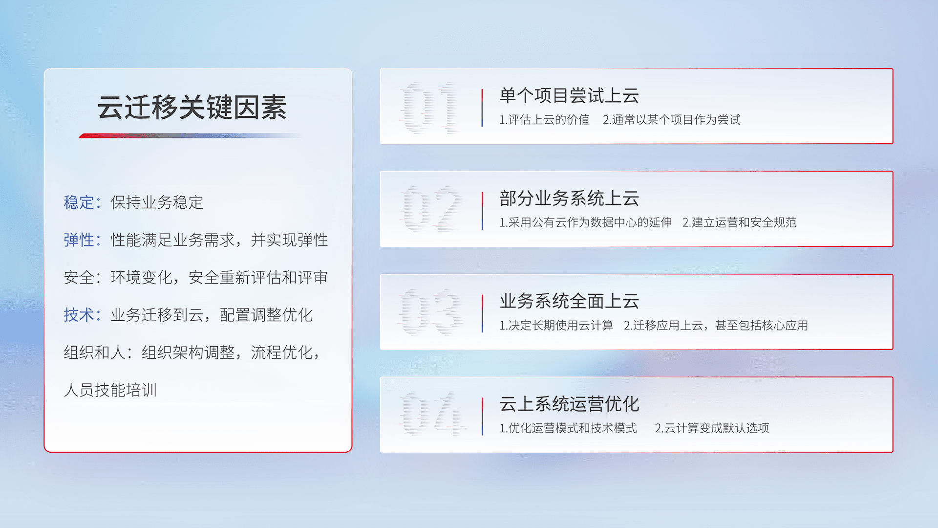 结合实际业务,,,从规划设计、、、云平台选型、、、云原生改造、、、数据迁移、、集成交付,,迁移全过程为客户识别最佳上云路径,,做好风险识别管理,,,设计网络架构、、、身份权限、、、安全审计合规、、操作审计、、、日志审计、、、、监控告警策略、、、、多站点容灾设计等,,,对云上基础设施进行整体规划,,,提升IT治理水平,,以满足弹性、、、、高可用、、、、高性能的需求。。