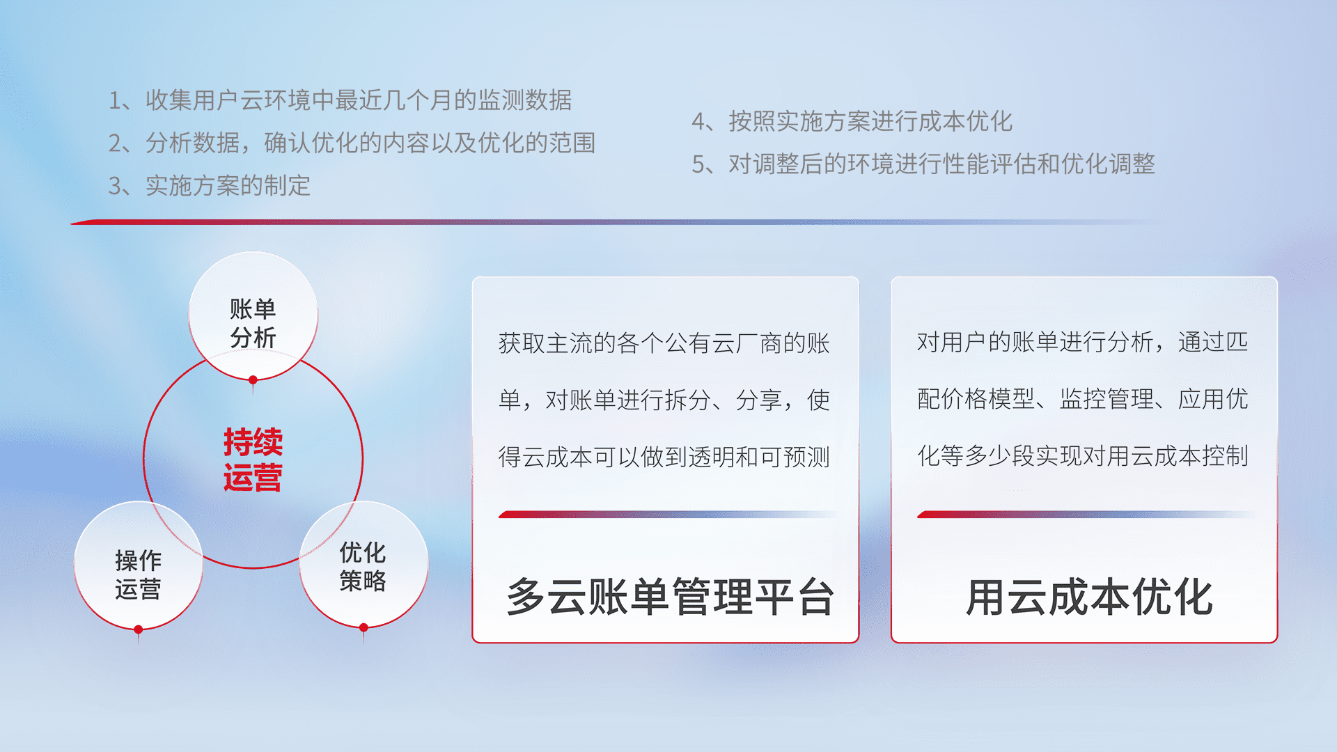 通过多云纳管,,以统一的资源数据模型把客户的云资源进行抽象和封装,,,进而实现对多云资源的统一操作,,,保障云资源管理的可靠性、、稳定性与可用性。。。量身定制化运维内容,,配置、、、、开发运维、、、、补丁管理、、备份、、、、监控、、、认证和访问管理、、审计和日常巡检等,,,保障在用云过程中的可靠度,,稳定度以及高可用率。。。。
